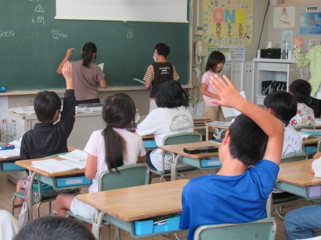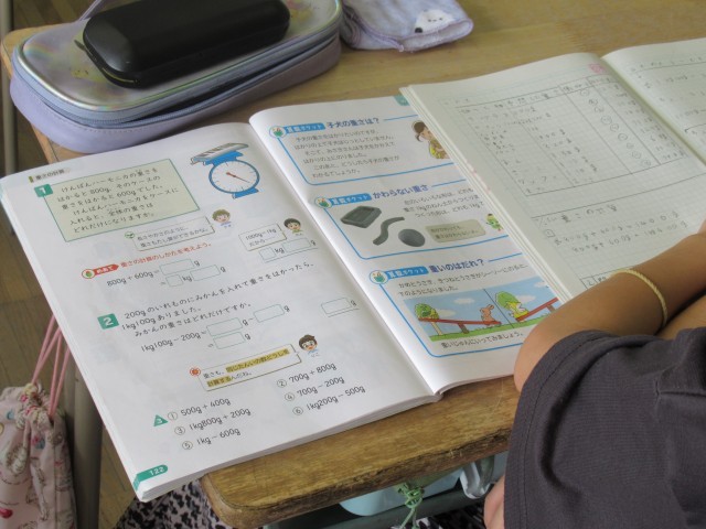 算数で重さの計算を学習しています。kg、gなど単位を間違えないように計算をしていきます。