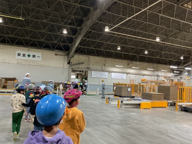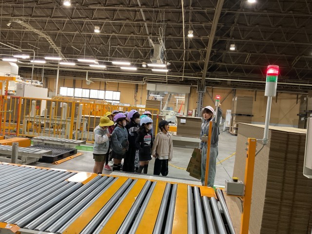段ボールの作り方や材料、機械の種類などの説明をしていただいた後、工場内を見学させていただきました。