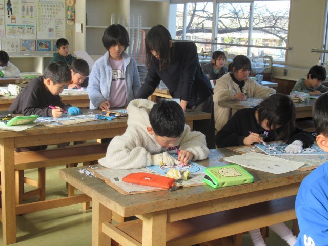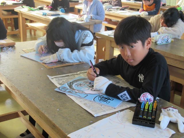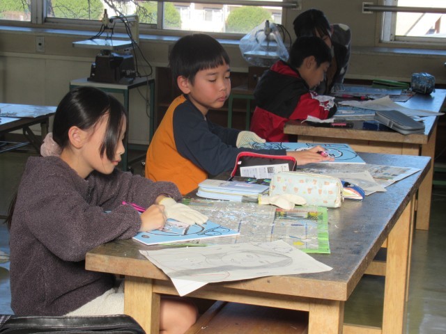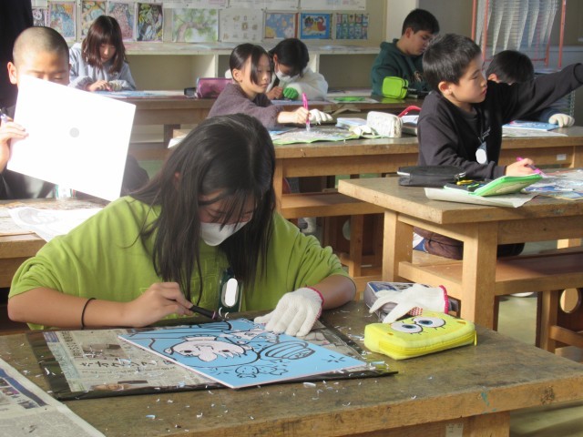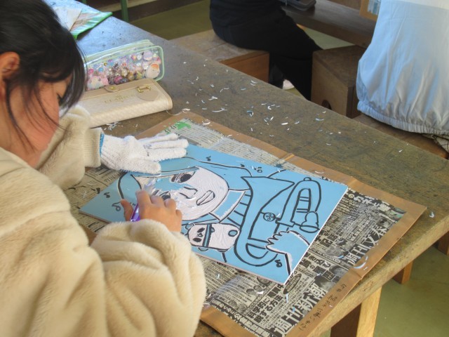 図工で木版画に取り組んでいます。ていねいに細かな部分まで彫って、少しずつ完成に近づいています。