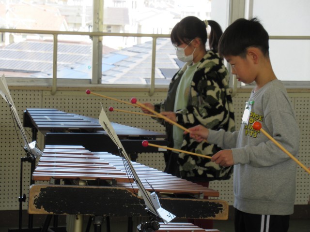 「ラ クンパルシータ」の木琴演奏テストの様子です。他の子はリコーダーや鍵盤ハーモニカの演奏で応援をします。