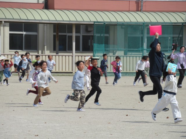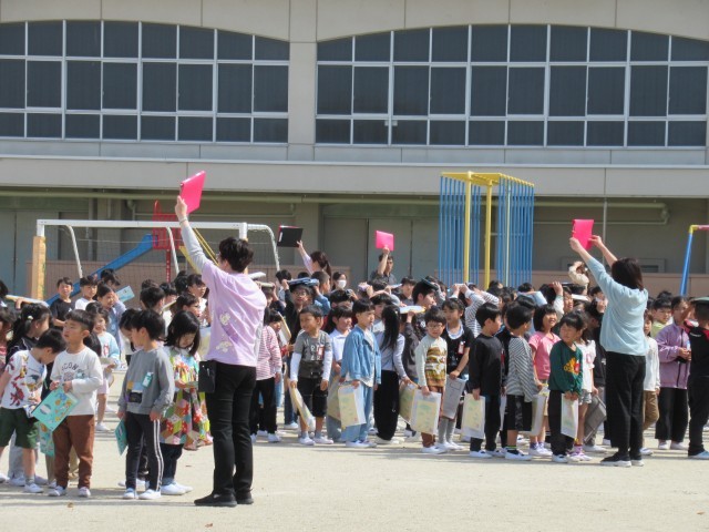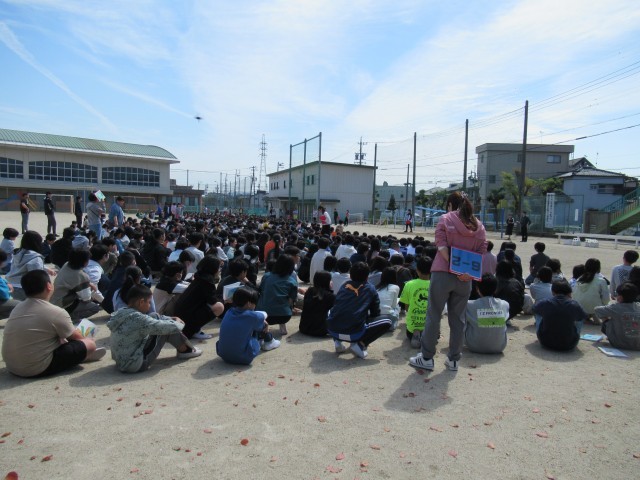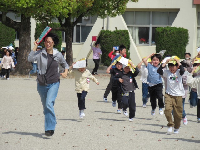 本日(14日)今年度1回目の避難訓練を行いました。地震発生に伴う避難で、教室での対応、避難するときの注意、運動場に出てからの行動などを確認しながら実施しました。