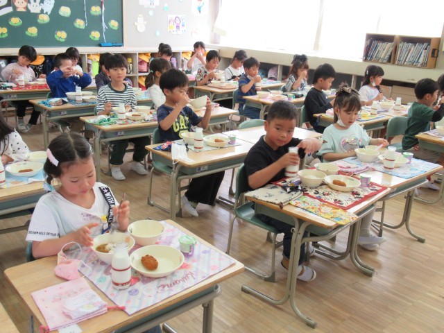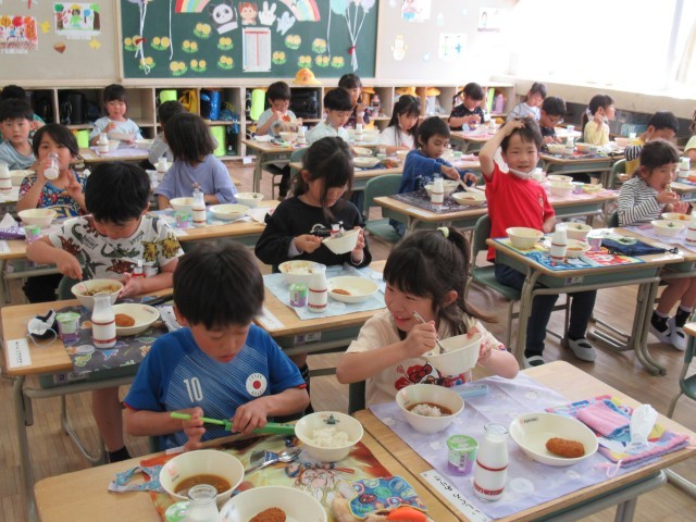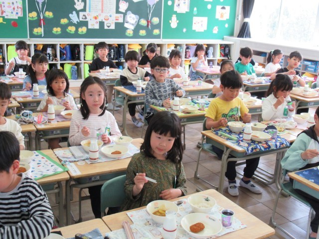 初めての給食(1年生) 公開日 2026/04/20 更新日 2026/04/20 1年生 1年生が今日から給食が始まりました。今日の献立は「麦ごはん 牛乳 カレーライス コーンフライ ぶどうゼリー」です。しっかり残さず食べましょう。 +1 いいね(1)