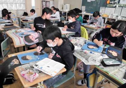 5年生 図工 公開日 2018/02/28 更新日 2018/02/28 5年生 一版多色刷り版画に挑戦しています。線彫りした版木に少しずつ絵の具を塗って、黒い用紙に刷っていきます。何度も重ねて刷るので、黒い用紙は版木にテープで固定してずれないようにします。おもしろい作品ができあがりそうです。 いいね(0)