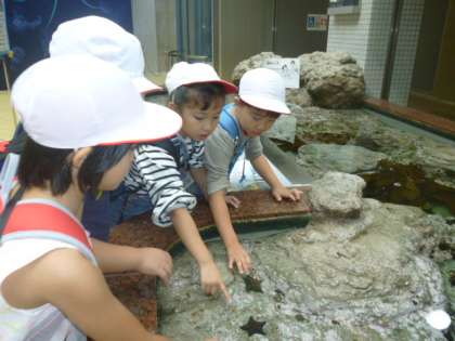 いるかのパフォーマンス会場では、大型TVにうつって大喜びでした。とってもすてきなショーをみることができましたね。タッチタンクで生き物をさわったり、グループ行動で協力しながら見学することができました。