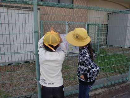 あるグループは、道路や駐車場にゴミが捨てられていることを問題と考え、ポイ捨て防止のポスターを作って呼びかけることを提案書にまとめました。そして、今日は実行の日です。協力して作ったポスターを学校周りのフェンスに取り付けました。