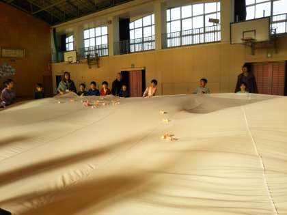 風呂敷を縫い合わせた大きな大きな布を使い「風呂敷バルーン」を楽しみました。