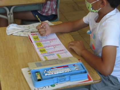 新しい漢字を勉強をしています。まずは手で大きく書き順を確認してから、漢字ドリルで練習をします。一文字ずつ丁寧に書きましょう。