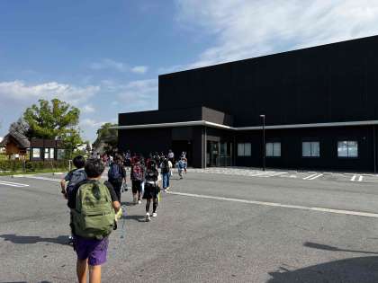 朝日遺跡ミュージアムに到着し、施設の方に説明を聞きます。