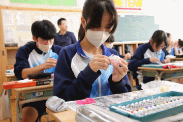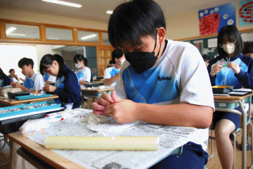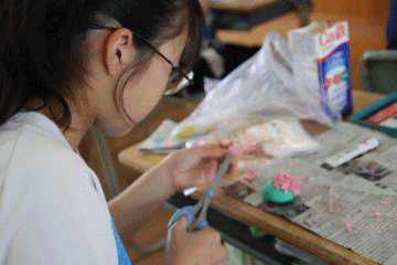 紙粘土を使って生徒一人一人が考えた和菓子の制作に取り組みました。糸などを駆使して模様を丁寧に
