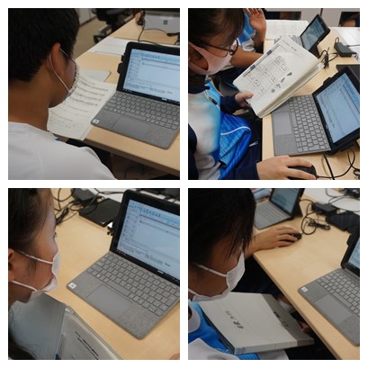 1年生はコンピュータ室で、作詞作曲に取り組んでいます。メロディー作りに四苦八苦しています。学年行事「ホリリンピック」のクラスソングになるので、みんな一生懸命です。