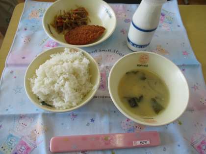 今日のメニューは、ごはん、牛乳、まごわやさしい白みそ汁、かつおフライ、きんぴらごぼうでした。昼の放送でも取り上げられた、1日1回は摂取したい7つの食材「まごわやさしい」について、覚えておくとよいですね。