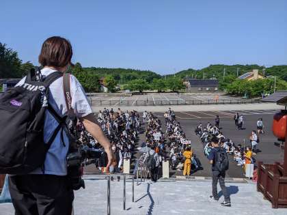 ゆのくにの森に着きました。 点呼を取って、学年写真の準備をしています。