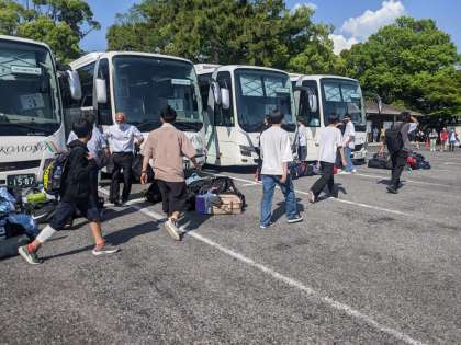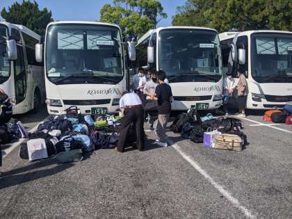 ここからは、地域別に乗り換えます。クラスのバスにあった大きいバッグを、先に駐車場に着いたクラスの生徒たちが、全クラス分運び出していました。
