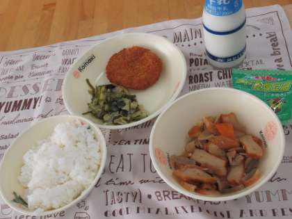 今日のメニューは、ごはん、牛乳、豚肉と野菜のうま煮、キャベツ入りメンチカツ、海藻サラダ、乾燥豆腐でした。