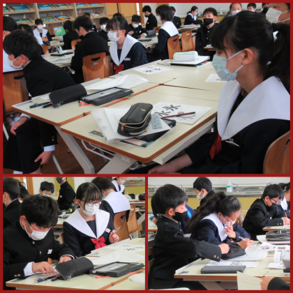レタリングに取り組んでいました。練習として、永字八法と呼ばれている、基本的な点画や筆づかいがすべて含まれる「永」のレタリングを行っていました。手本を見ながら、丁寧に描き進めていました。