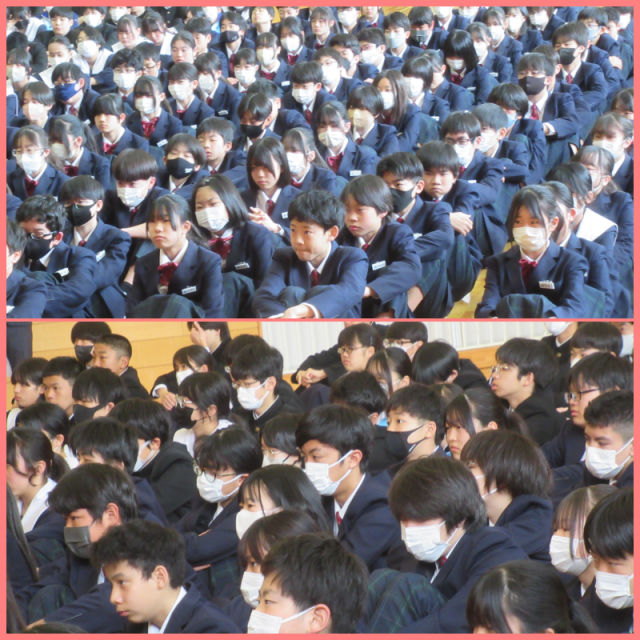 各学年の代表生徒に通知表を渡しました。その後、校歌斉唱と校長先生のお話、生徒指導主事からも春休みの過ごし方について、話がありました。