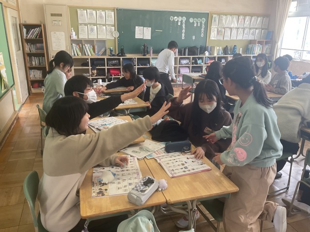 外国語の時間では、ジャスチャーゲームやすごろくを使って5年生の外国語の復習をし...