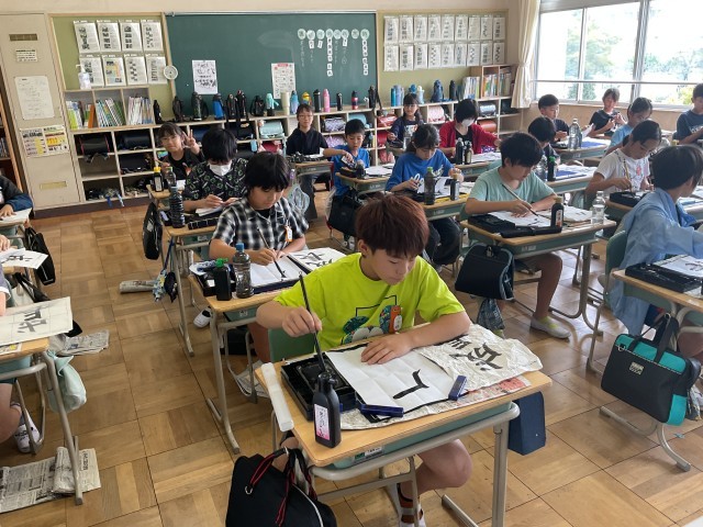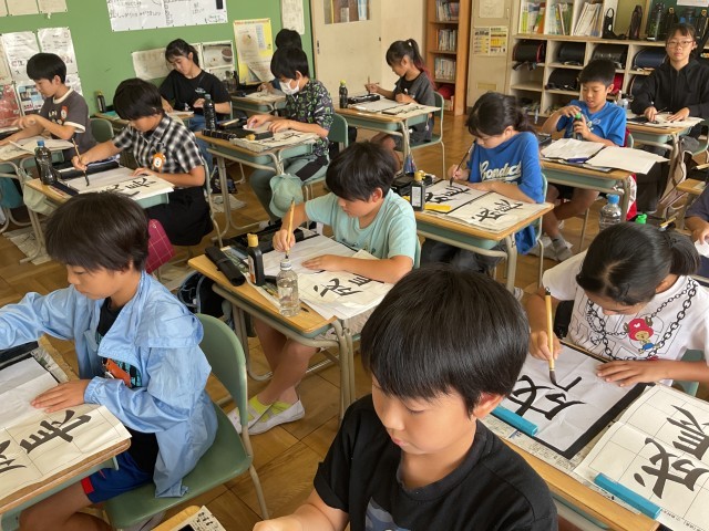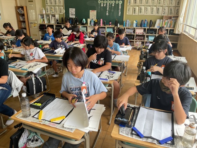 書写競技会の様子です。「成長」を書いています。繰り返し何度も練習し、一生懸命取り組みました。