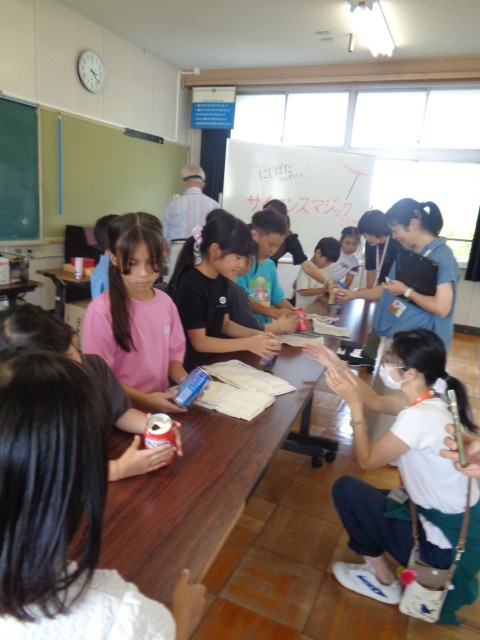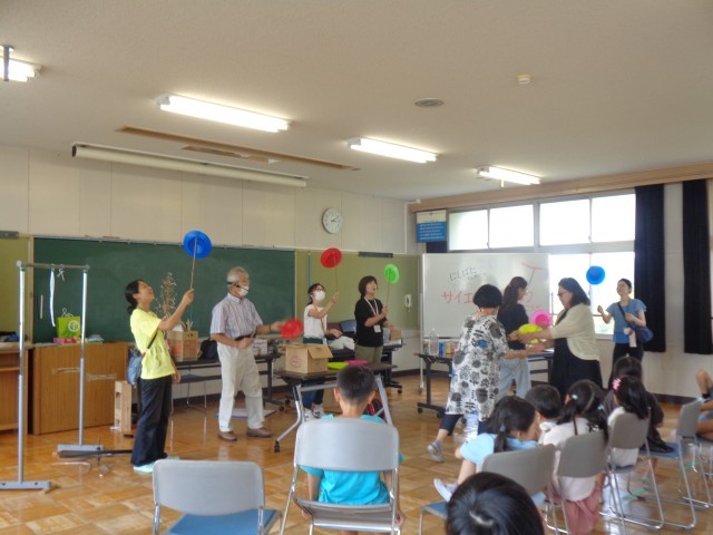 皿回しや竹とんぼを使った回転の原理のショーや、うがい薬を使って水の色が変わる実験など、体験型の楽しい内容に子どもたちは大盛り上がりでした。