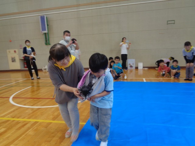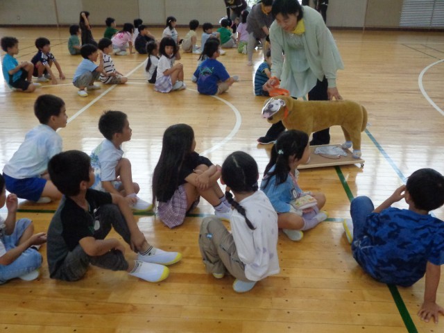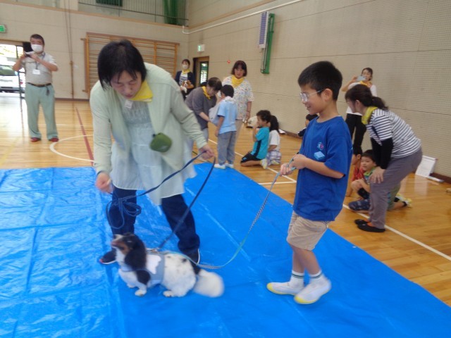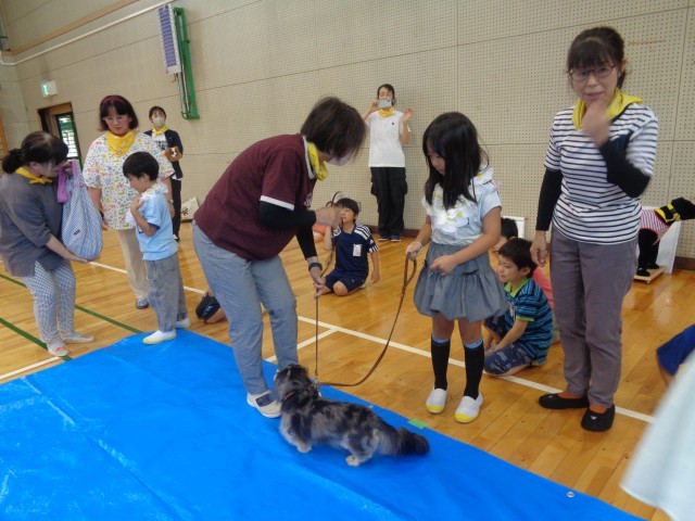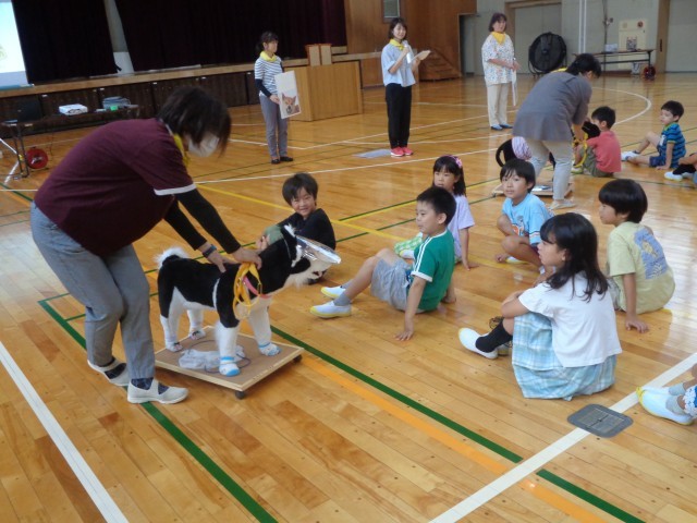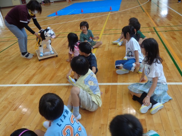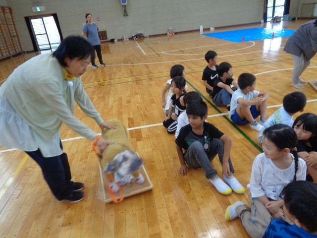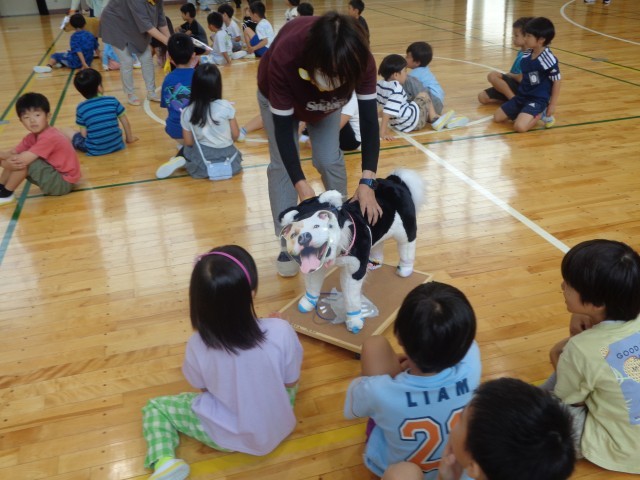 愛知県動物愛護センターの方にきていただきました。ぬいぐるみを使った犬の接し方やしつけ方を教えて頂きました。