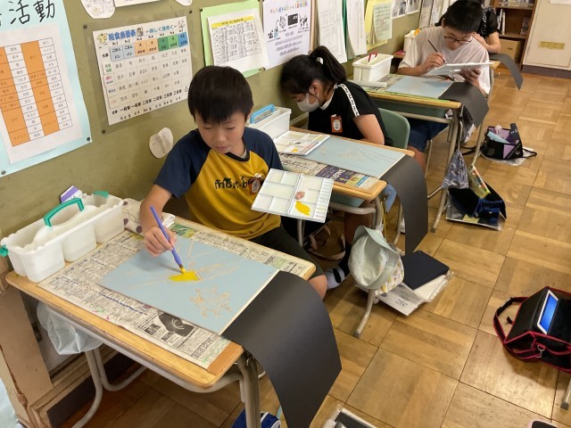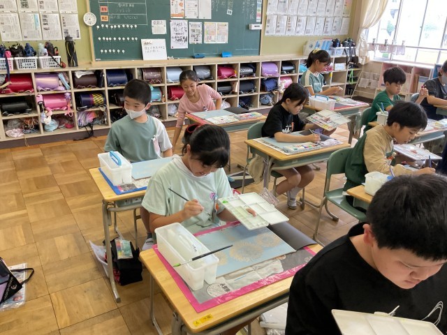 図工競技会で一版多色版画をしています。みんな一生懸命頑張っています。