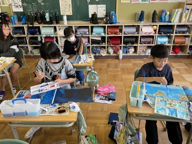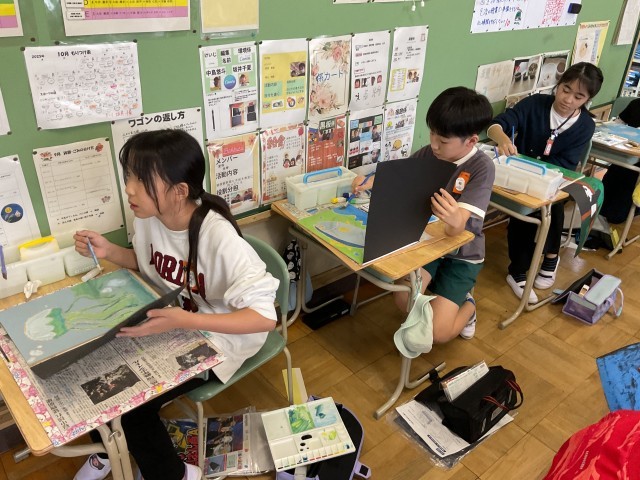 何度も繰り返し版画に色をつけています。色鮮やかな作品ができています。
