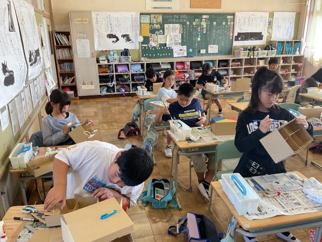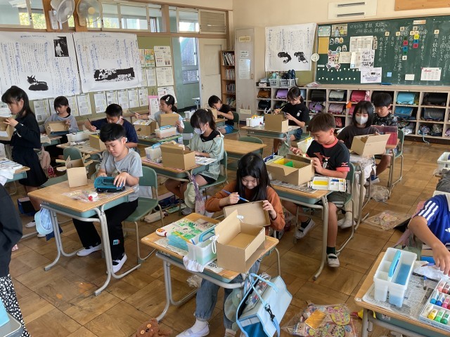 仕切りを作ったり、色を塗ったりとオリジナルの段ボールボックスを作っています。