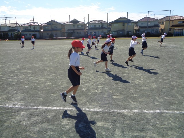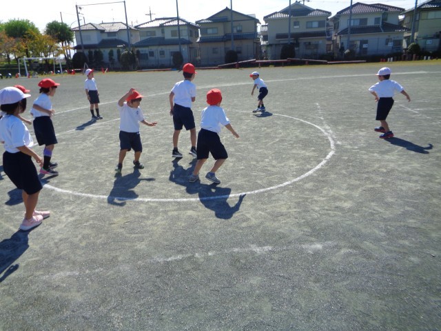 最初に片足跳びをしました。片足で、たくさん跳べました。