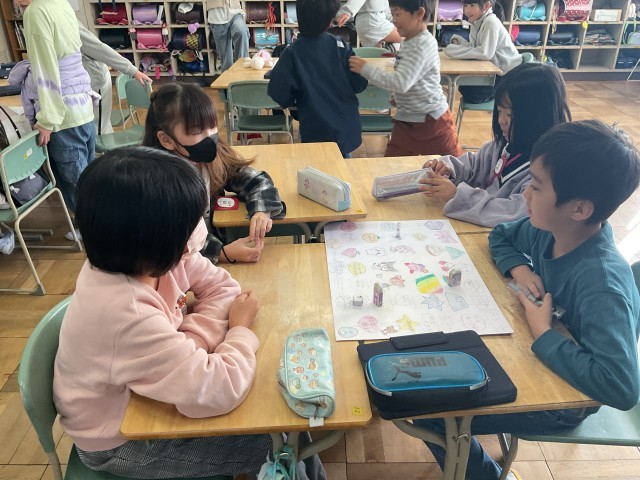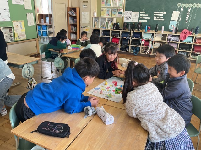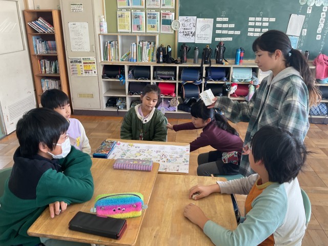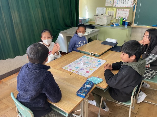 5年生が自己紹介すごろくを作り遊び、そのあとは5年生の考えたゲームをして交流をしました。