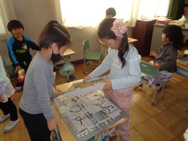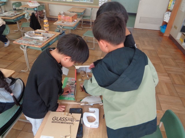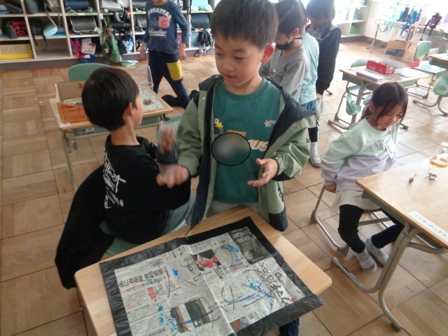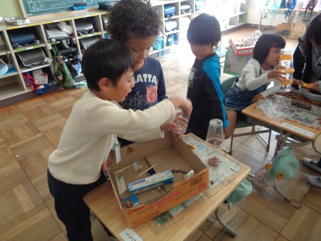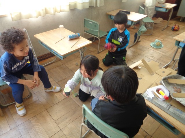 作ったおもちゃを見せ合い、一緒に遊びました。