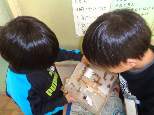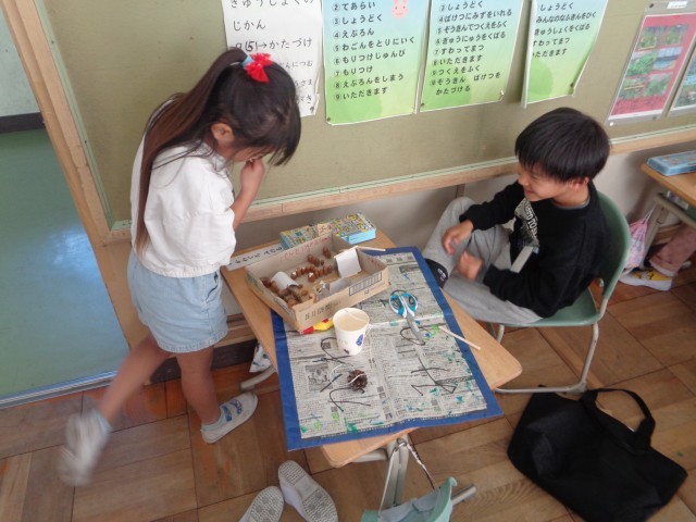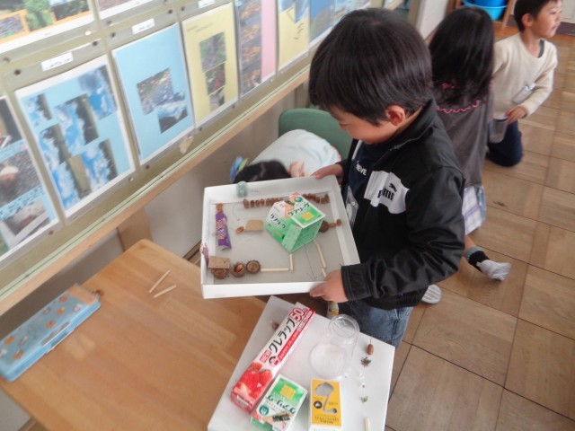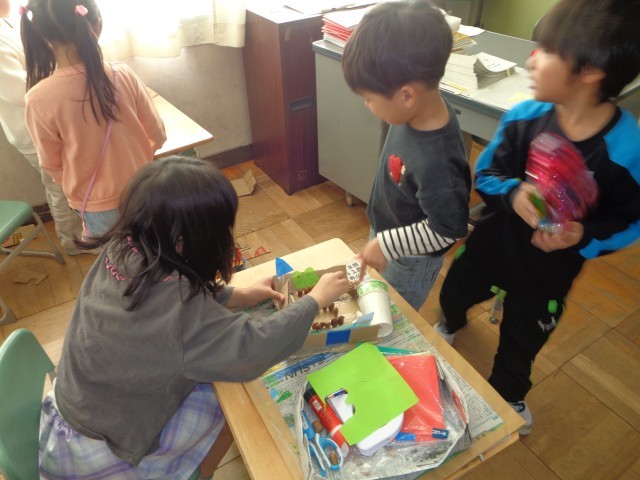 葉や木の実、身の回りの材料を使って、おもちゃや楽器を工夫してつくりました。
