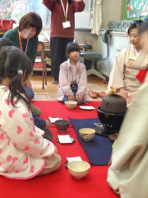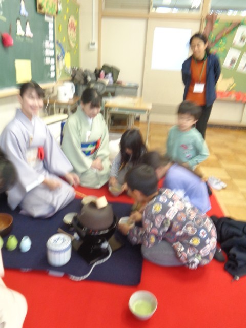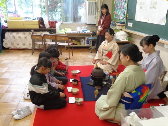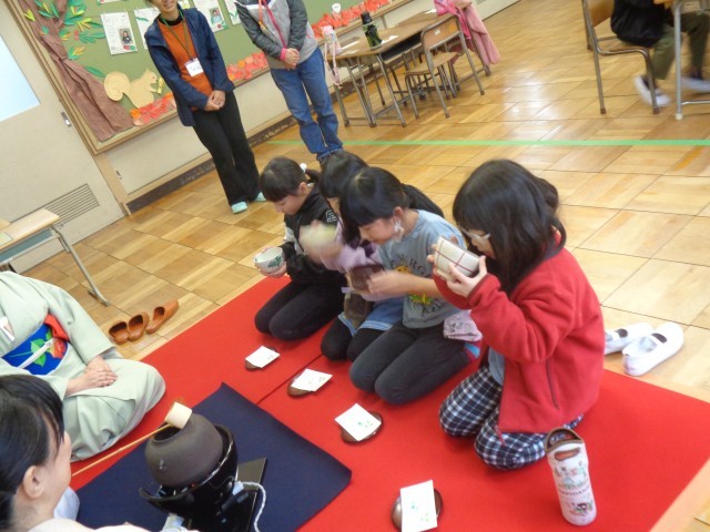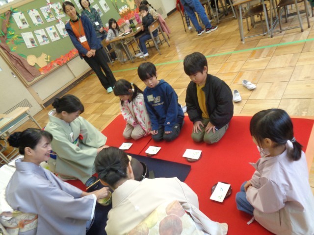 松本先生をお招きして、お茶会を行いました。お茶菓子のいただき方やお抹茶の飲み方を教えていただき、一部の児童は実際にお抹茶をたてる体験もさせていただきました。少し苦くて驚く児童もいましたが、みんな楽しみながら日本の伝統文化にふれることができました。