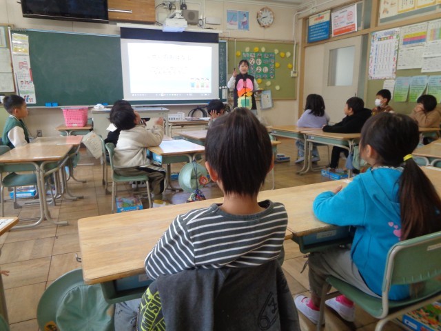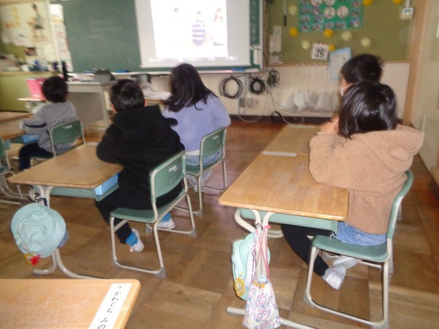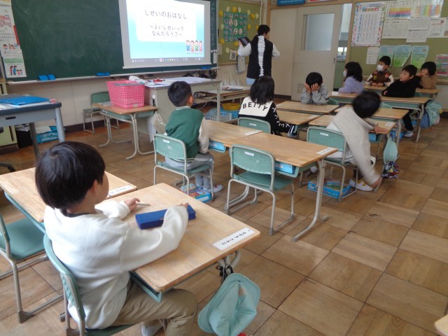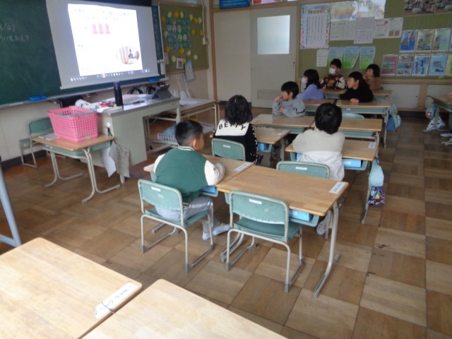 「良い姿勢ってなんだろう」をテーマに保健委員のつくったビデオを視聴し、養護教諭に姿勢についての話を伺いました。