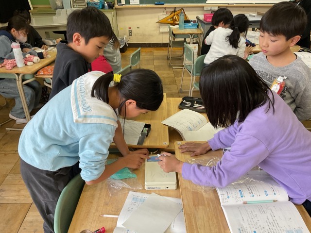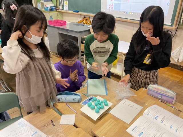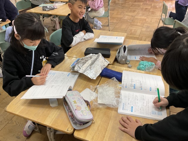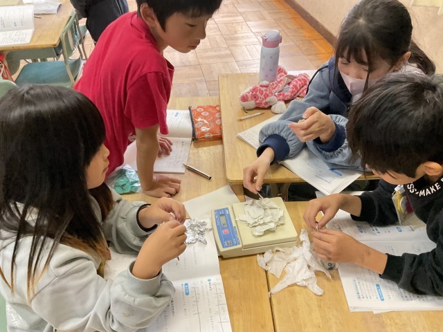 粘土、アルミホイル、ティッシュ、紙を使って形が変わると物の重さは変わるのか調べました。
