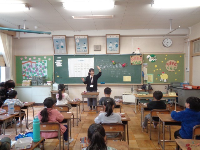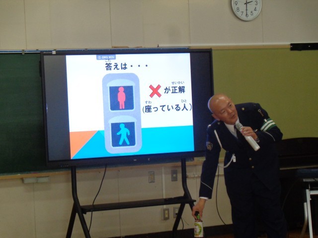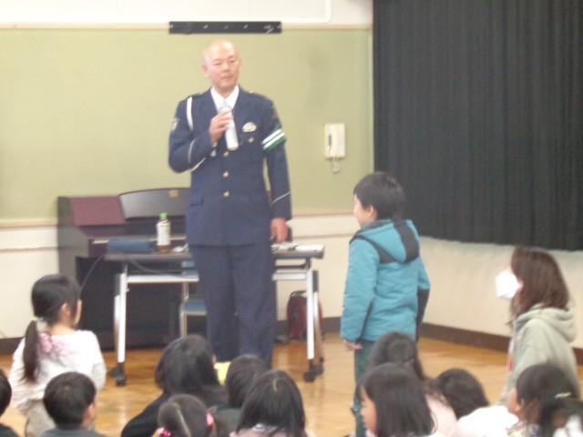 小牧警察署の方をお招きし、交通安全について楽しく学びました。信号の位置や横断の仕方、自転車の乗り方などを○×クイズで確認したり、「ガリガリ君が当たる確率」のお話もあり、子どもたちは興味津々。