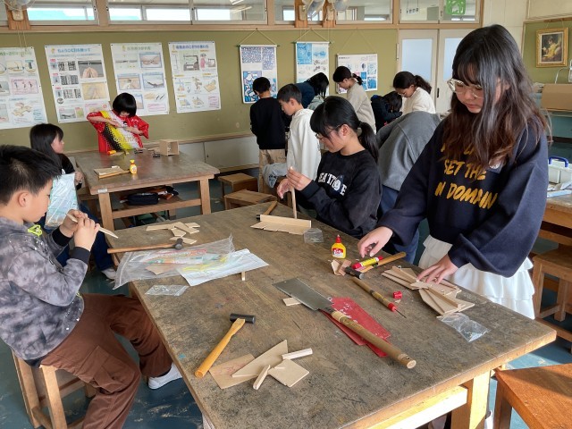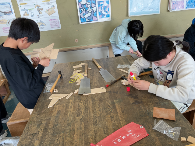 のこぎりでギコギコ、釘をトントン、みんな頑張って作っています。