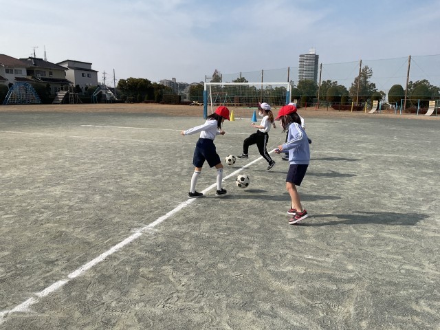 ボールが飛んでいかないよう、蹴り方に気をつけてドリブル練習を頑張りました。