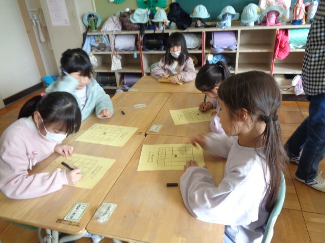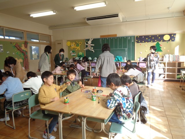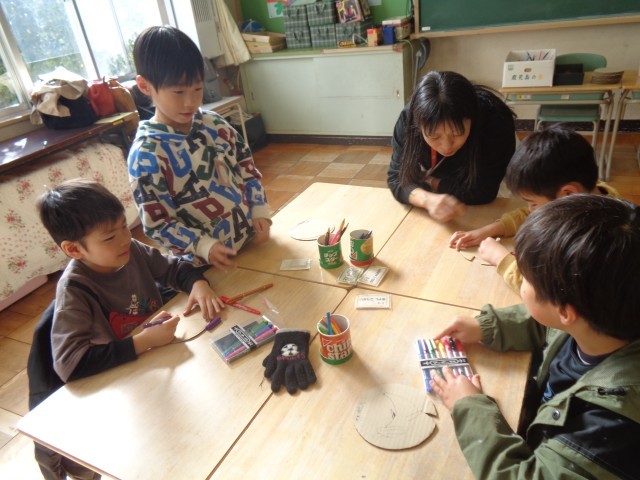 丸く切ったダンボールにお絵描きをして、自分だけのフリスビーを作りました。完成した作品を輪ゴムを使って飛ばすと、みんな夢中になってフリスビー遊びを楽しんでいました。
