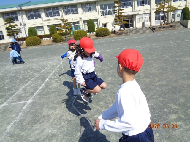 なわとびの前跳び、後ろ跳び、駆け足跳びや大繩の大波小波やゆうびんやさんをしました。