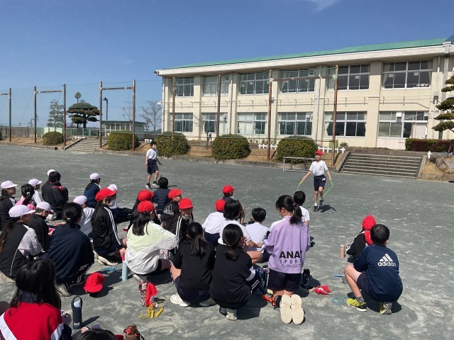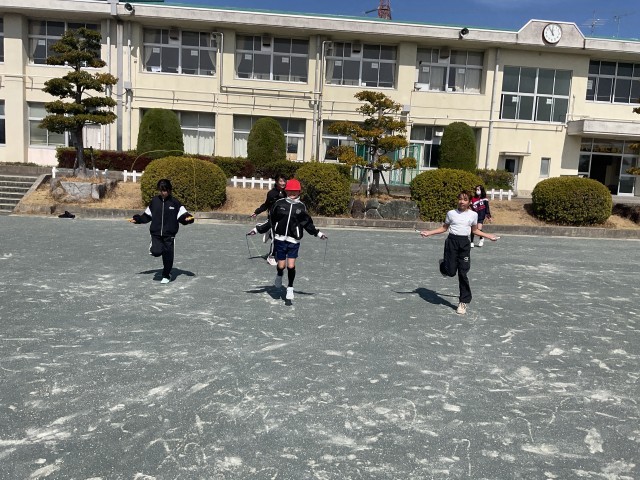 体育の時間に学年で縄跳び大会をしました。一生懸命跳ぶ姿や自然と「がんばれ」と応援する姿が見られました。