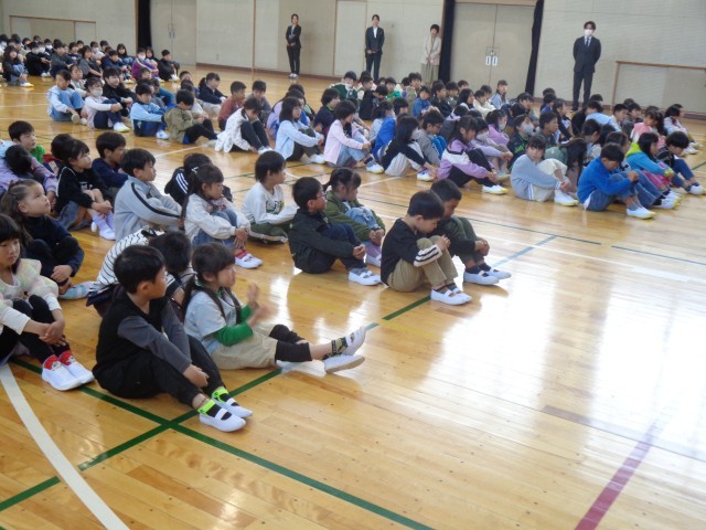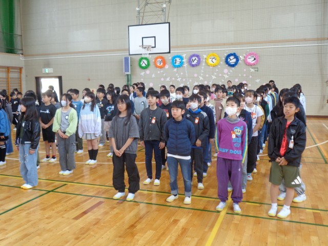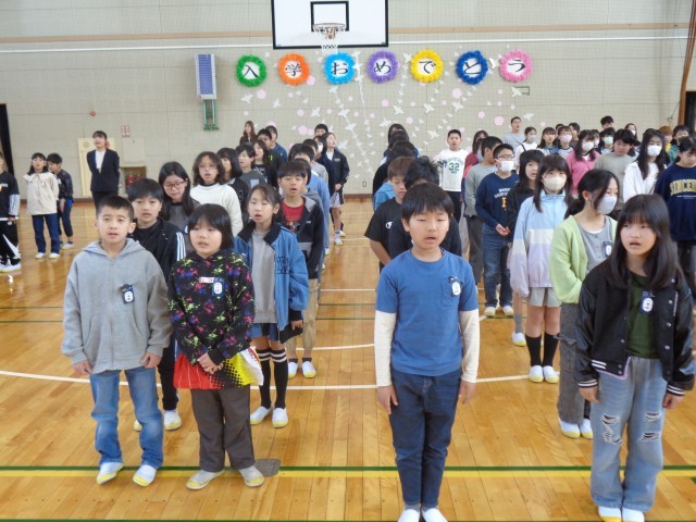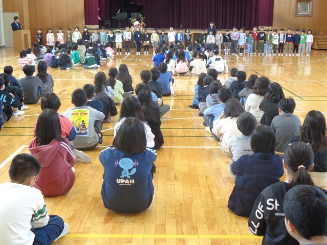 その後、1年生との対面式が行われました。1年生35人を迎え入れ、全校児童255人で、体育館いっぱいに響き渡る声で校歌を斉唱しました。