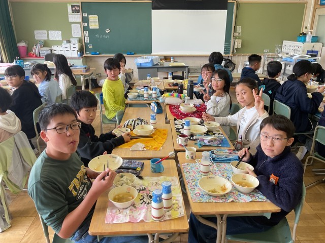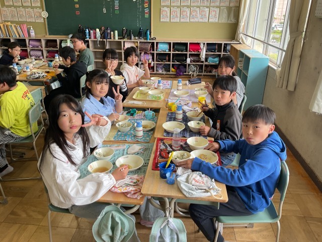 6年生になり給食が始まりました。みんな楽しく食べています。