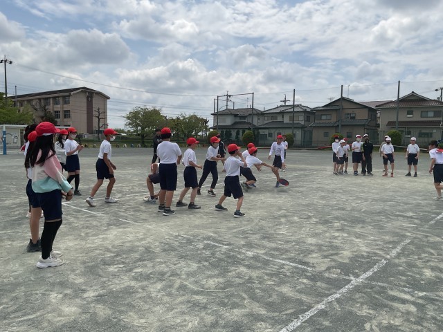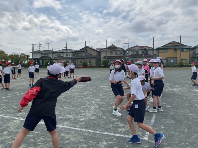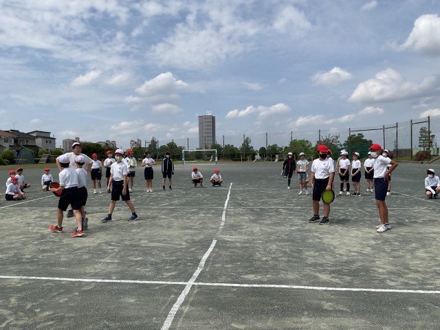 1組2組合同でドッジビーを行いました。各クラス男女別のチームに分かれて、少しでも内野に残れるよう声をかけ合いました。