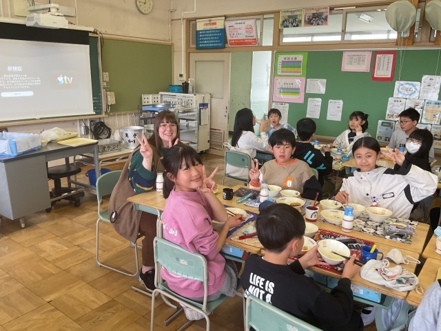 給食の時間にALTのダイアナ先生がきて、一緒に給食を食べました。