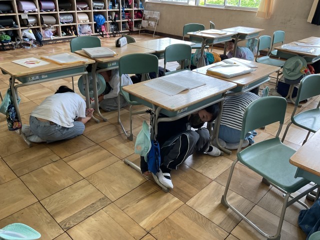 地震が起きたら、どのように身を守り避難すればよいか、訓練をして考えました。