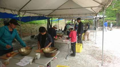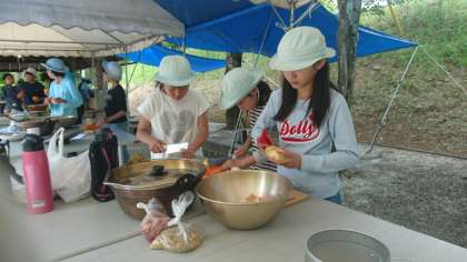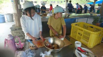 今日のお昼ごはんはカレーライス。野外炊飯場を使って自分たちで作ります。学校で練習した時のようにうまくできるかな?