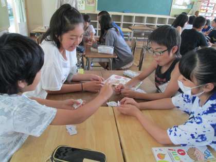 英語の時間には、アルファベットを発音しながらのカードゲーム。