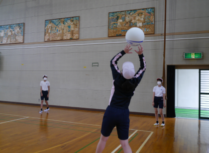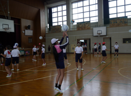 今日は雨模様。晴れていたらハードル走をの学習を行う予定でしたが、体育館でソフトバレーボールに挑戦することに。アンダーハンドパスとオーバーハンドパスをやってみました。