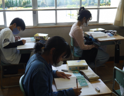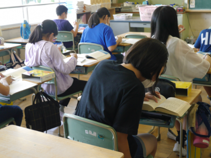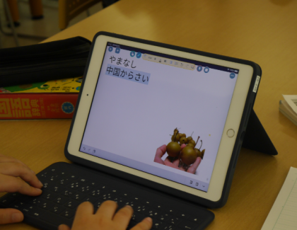 国語の授業では「やまなし」というお話を勉強しています。今日はまず、単語の意味を国語辞典を使って調べました。その後、タブレットで「単語カード」を作りました。それぞれの単語の意味を打ちこんだり、イラストや画像を挿入したりして、いつでも単語の意味をふり返ることができるようにしました。