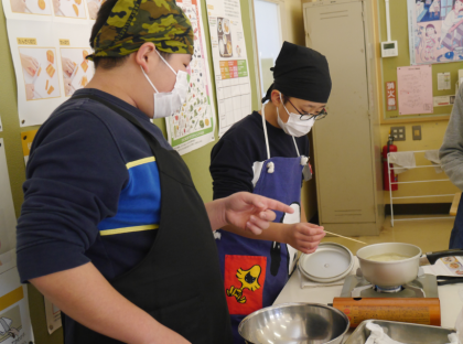 今週は、一人一人で計画したおかずづくりです。みんな作るものが違うので、自分自身がしっかりと手順を理解しておかないといけません。作り始める前はどきどきだったけれど、完成した後は達成感でいっぱいでしたね。
